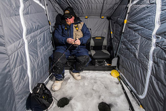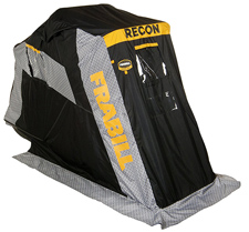 The Frabill Recon, shown in the photo at left, is one of a number of flip-overs from Frabill. The Recon is a one-person, quick-deploying, sleek shelter that retails for $229.99. Such one-person flip-overs provide a small, dark space that can work well for sight-fishing, blocking out light, too. Frabill’s SideStep shelters are the most innovative portable shelters in a decade, the company says. They feature two doors on each side to enter the shelter conveniently, instead of a front door that’s on most other shelters.