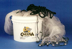 They come in mesh They range from slow sinking to very fast sinking and are heavy, weighing 1 ½ pounds per foot. In other words, a 10-foot net weighs 15 pounds. The company also makes Cracker Cast Nets that are the econo version. Check out a cool video on how to throw a Calusa Cast Net. For more info, visit the Calusa Cast Net web site. |